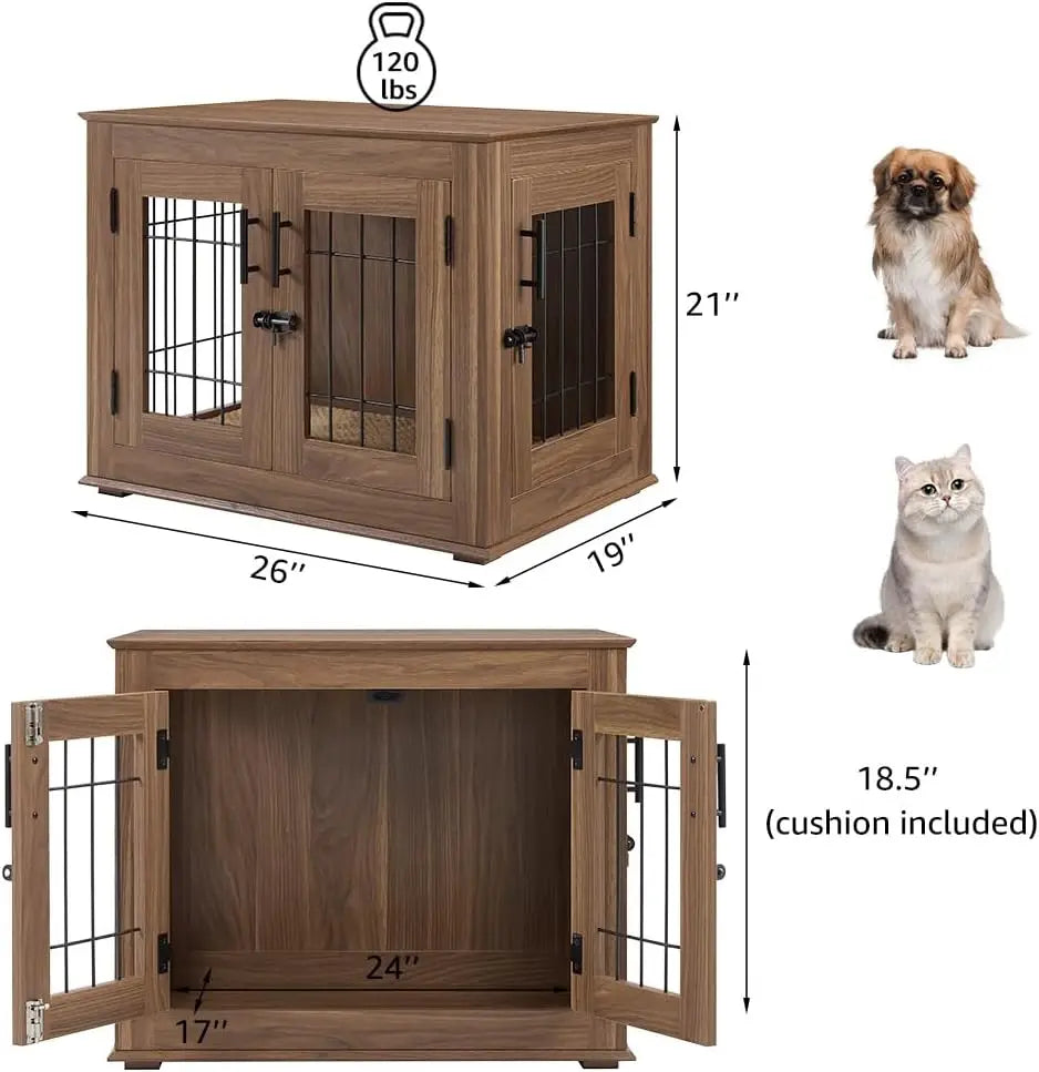 Discover the perfect blend of style and functionality with our furniture-style pet crate. This versatile piece serves as both a cozy pet home and an elegant end table, seamlessly integrating into any room decor. Crafted from high-quality materials, it ensures durability and stability for long-lasting use. Key Features: 1. Durable Construction: Designed with sturdy metal wire enclosure bars, this crate is built to withstand daily wear and tear. It's ideal for training small pets, providing a secure and comfortable space. 2. Multi-Functional Design: Transform this pet house into a stylish side table, nightstand, or decorative accent piece. The furniture-style aesthetic adds a native feel that complements your home interior without looking out of place. 3. Included Soft Cushion: Comes with a removable pet bed that offers comfort during nap times. The cushion is easy to clean and maintain, ensuring your furry friend enjoys restful moments. 4. Spacious Top Surface: The wide top provides additional storage space for pet supplies like toys or treats, making them easily accessible. It also serves as a perfect spot for displaying magazines, family photos, books, lamps, or other decorative items to enhance your living area. 5. Double Doors for Convenience: Featuring easy-access double doors that can be installed on either end of the crate for flexibility in placement. Equipped with secure latches and locks to ensure safety while allowing pets to enter and exit freely. 6. Well-Ventilated Comfort: Designed with ample ventilation holes to promote airflow and keep pets cool during warmer days. The full-view design helps nervous animals feel safe by allowing them to see their surroundings clearly. 7. Peaceful Interaction Time: Enjoy quality moments with your pets as you observe them through the clear view panels without disturbing their peace—ideal for bonding sessions or simply watching over them while they relax inside their new home.